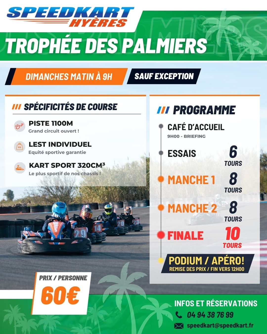Lest individuel pour une course plus fun et plus équilibrée. Tout le monde roule au même poids… Au programme de notre trophée : Café d’accueil à partir de 9h00 durant l’inscription et le briefing – 1 séance d’essais chrono de 6 tours qui détermine la grille de départ – 1ère manche de 8 tours – 2ème manche de 8 tours – 3ème manche de 10 tours Podium et remise des trophées Apéritif offert pour débriefer de la course